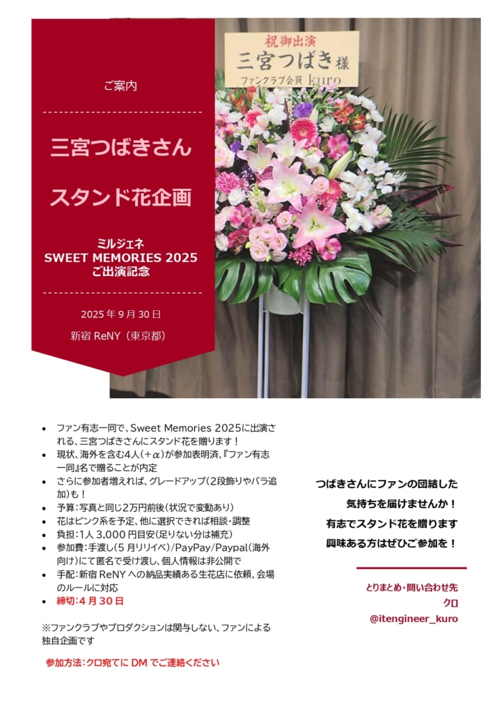 4月16日:XにSweet Memoris 2025で「ファン有志一同」でスタンド花を贈りませんかと提案、以降、DMにて参加希望者と相談・調整